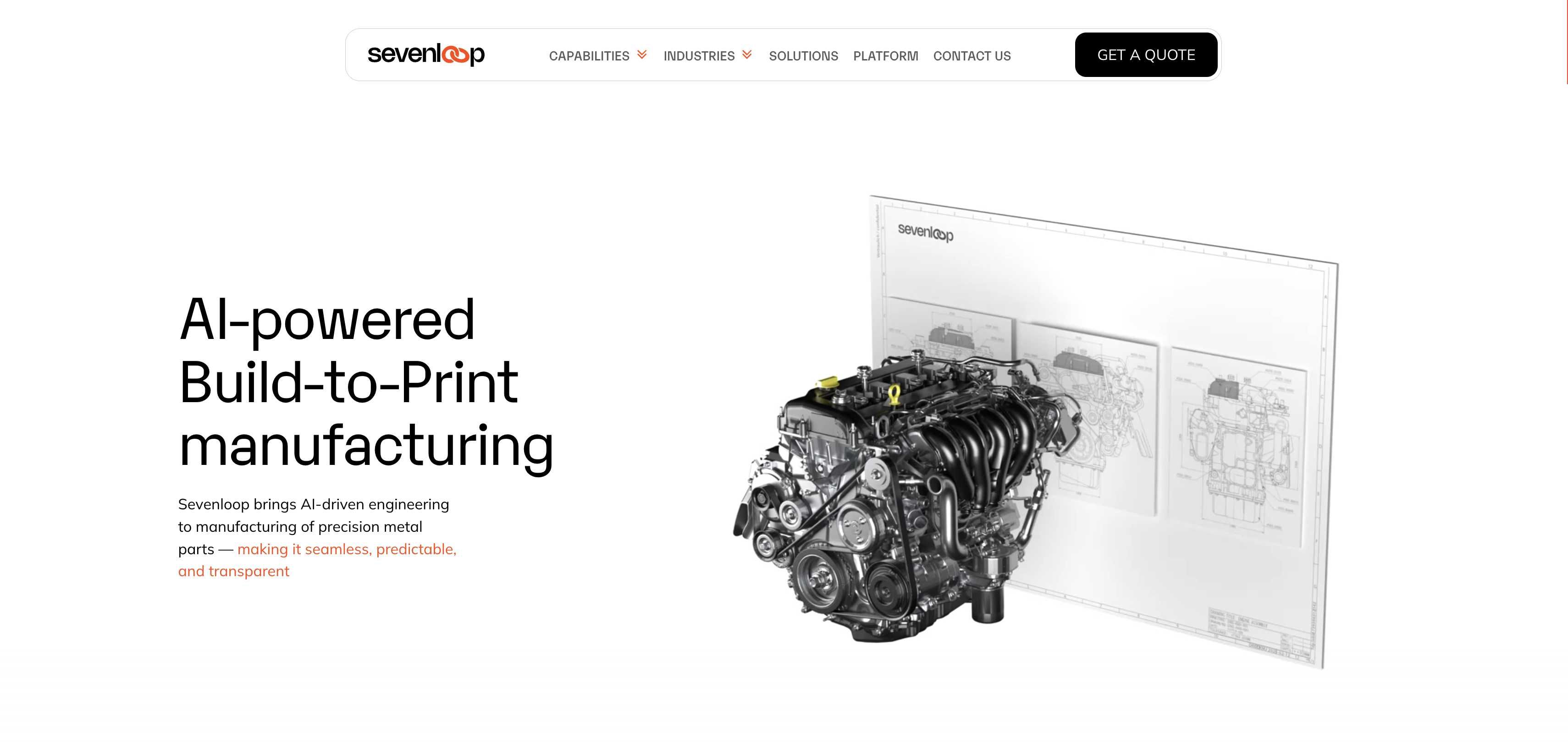 If you see here the hero message says "AI-powered Build-to-Print manufacturing" it clearly says the what Sevenloop does, also with the supporting animation we are making sure buyers get the information. The body copy is also helping to nail the message here. Manufacturing of precision metal parts tells the buyer it is for metal parts. The nav bar is also important here - it tells that you can check the capabilities, industries, solutions. The drop down indication tells that there are multiple capabilities and industries. The button informs the buyer that there is an option to get a quote if required.